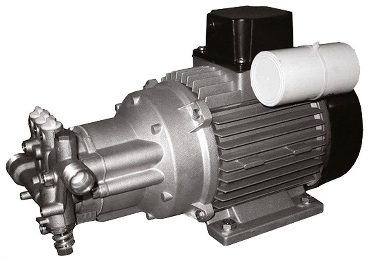 Трехпоршневый осевой электронасос Comet вертикальной конструкции с расположенным внизу насосом и полностью металлической конструкцией, без пластикового материала в компонентах.