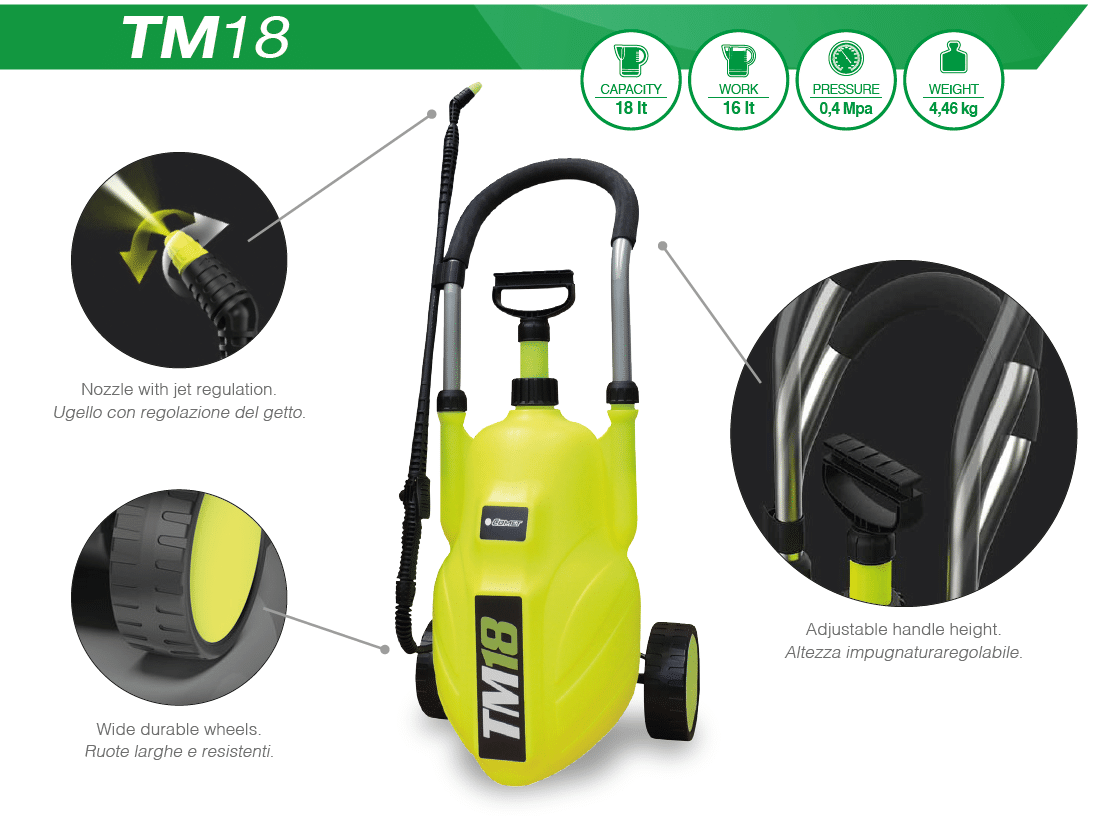 Мобильный ручной распылитель предназначен для профессионального использования и для работы в таких областях применения, как автомойка, опрыскивание, борьба с вредителями, Парниковая обработка, использование инсектицидов, фунгицидов, защита окружающей среды, больницы, школы, сельскохозяйственные и промышленные ангары. Идеально подходит для использования с продуктами для дезинфекции. Пластиковый бак имеет емкость 18 литров. Этот распылитель совместим со многими широко используемыми химическими веществами, кислотами и щелочными веществами. Безопасность и простота использования гарантированы.