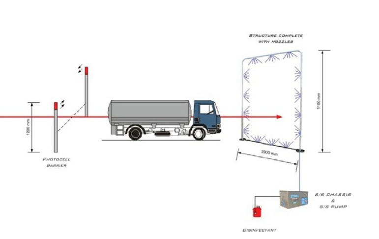 Автодезпост в сборе (дезрамка) для автоматической дезинфекции транспорта. Мы рады предложить вам новую автоматическую систему дезинфекции транспортных средств. Она состоит из насосной станции из нержавеющей стали с емкостью 80 литров для дез стредства, с эксклюзивным объемным заполнением, которая к тому же поддерживает постоянное количество воды и дезинфектанта, а также смешивает раствор, который затем подается на специальные форсунки по всему контуру , полностью изготовленного из нержавеющей стали. Применение Процедура дезинфекции управляется двумя фотоэлементами, размещенными на входе, т. е. после обнаружения транспортного средства они запускают насосную установку которая через форсунки распыляет дезинфектант на нижнюю, верхнюю и боковые (слева и справа) поверхности транспортного средства. Вода подается под давлением 5 бар, а общий поток на всех установленных форсунках составляет всего 30 л/мин. Это очень важная деталь, так как для подачи 0,5% дезинфицирующего раствора необходимо всего 100 г химического вещества, что обеспечивает значительную экономию по сравнению с аналогичными системами и очень низкие эксплуатационные расходы. Установка применяется для дезинфекции и мойки автотранспорта. Устанавливается как на улице, так и в помещении. Автоматическое включение и выключение установки в момент прохождения автотранспорта. Автоматическая продувка системы в зимнее время года.( требуется подключение воздуха)