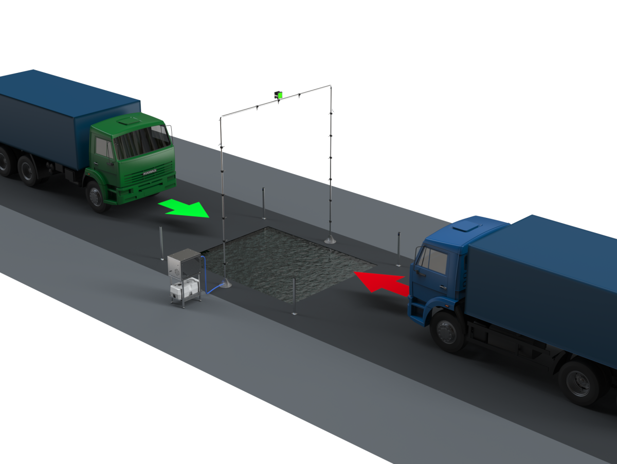 Автодезрама с внутренним проходным размером 4006х4544. Портал из нержавеющей трубы Ф40 мм с пластинами для крепления на ровном основании. По периметру портала 15 форсунок для распыления дезсредства на поверхность автомобиля. Без перекатов. Устанавливается над ванной для дезинфекции колес.