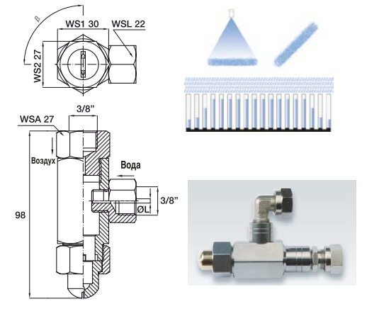 Атомайзеры серии MC, как правило, используются для охлаждения листовых заготовок, реже блюмовых и сортовых заготовок. У них плоскоструйная форма распыления и внутренняя резьба 3/8” для воды и воздуха. О всем атомайзерам серии MC прилагается диаграмма величин расхода/давления, для возможности настройки насосов на требуемый расход. Сопло атомайзера изготавливаются из никелированной латуни по запросу для обеспечения минимального износа форсунки.