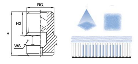 В зависимости от размера, данные форсунки изготавливаются из брусков или литых заготовок (смотрите чертежи на странице), размер и вес указаны ниже в таблице. Они идеально образом подходят для максимально равномерного покрытия поверхности. Несущественно, что края квадратного профиля струи находятся не в линии с /сопловым отверстием, угол отклонения равен 10° - 15°, в зависимости от рабочего давления и расстояния. При установке или обслуживании необходима точная настройка.