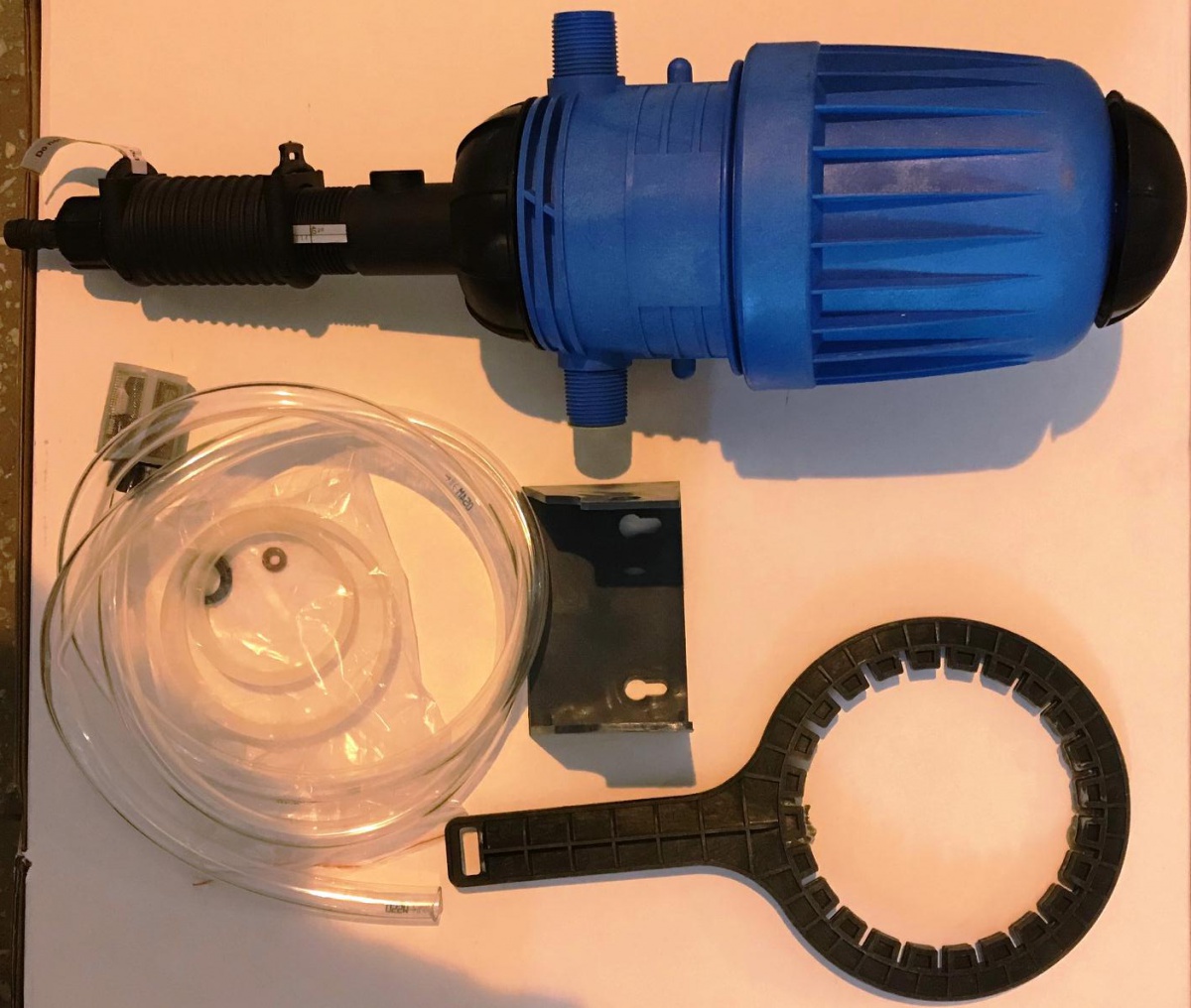 Дозирующий насос Дозатрон Dosatron с водяным приводом, выполнен из полиамида 12 и стекловолокна с уплотнениями из синтетической резины. Устойчив к большинству химических веществ. Наружная резьба ¾” на входе и выходе, давление воды 0,2-8 бар, 40°C, расход воды до 40 л/мин, процент дозирования 0.4-4% 250/1-25/1.Ratio 0.4--4%; Flow 25--2500L; Pressure 0.2~8 Bar рекомендация: разобрать и удалить смазочный материал со всех резиновых уплотнений для долговечной работы устройства