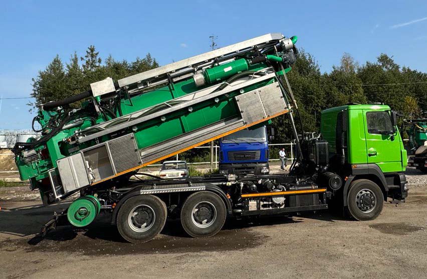 - Напорно-всасывающий рукав диаметром 125 мм и длиной 18 м — на кассете с манипулятором. Манипулятор поворачивается на 180°, выдвигается гидравликой до 4,6 м, угол подъема 30°.