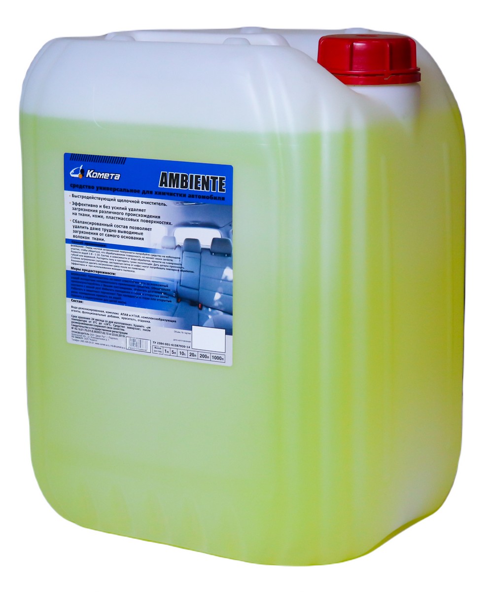 Средство AMBIENTE представляет собой зеленовато-желтую жидкость, смешивающуюся с водой в любых соотношениях. Обладает высокой обезжиривающей способностью, легко разлагает и удаляет пятна, обеспечивая полную чистоту салона. Применимо и для сильно загрязненных поверхностей. В состав входят присадки, стабилизирующие вредное воздействие компонентов на обрабатываемые поверхности, они предотвращают выцветание красок и растягивание ткани. Состав не оставляет разводов.