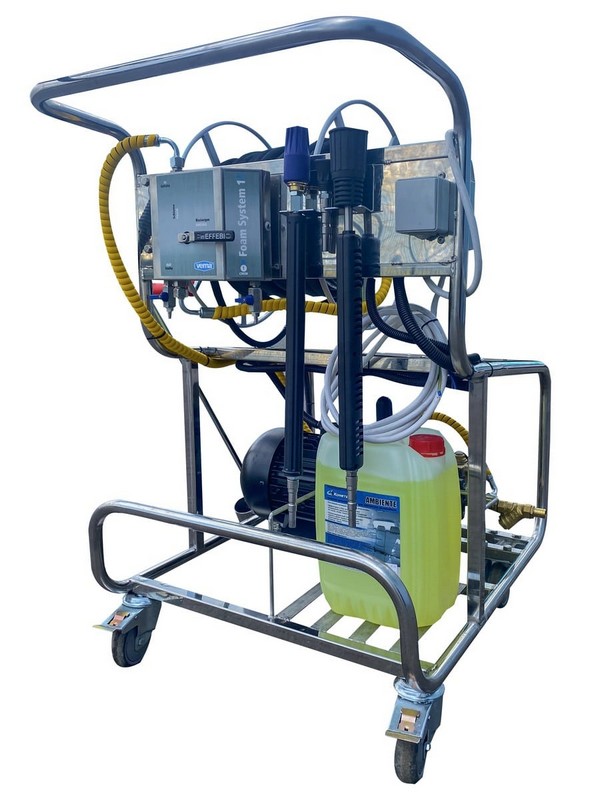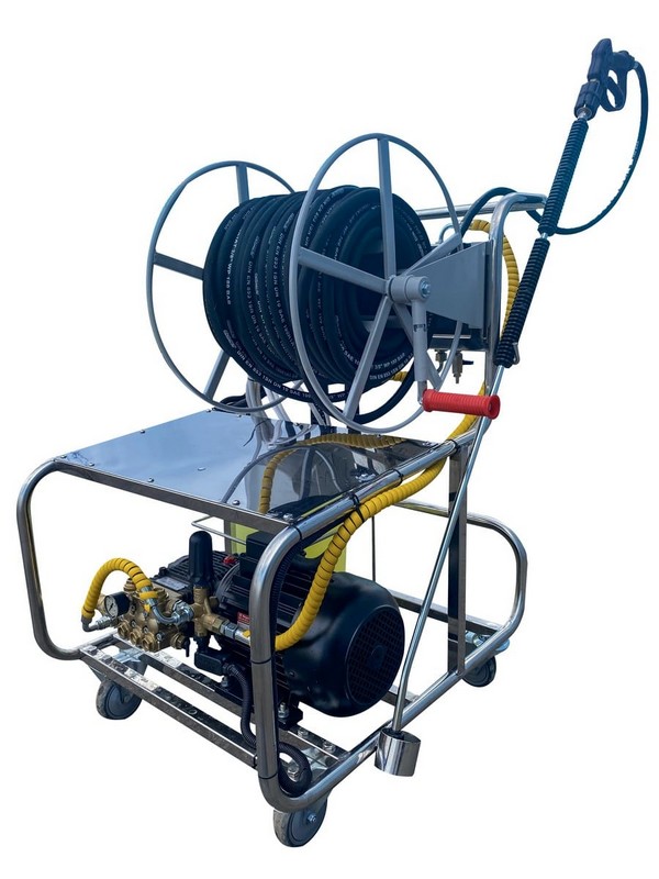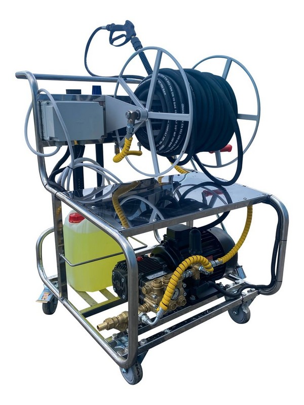 Установка с АВД и пенной станцией 5,5 кВт, 380 В,управление 24 В 21/150 c барабаном 50 м окрашеным на тележке из нерж. стали. Позволяет наносить моющие средства и мыть под давлением. Без подачи воздуха.
