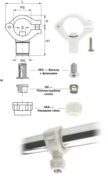 Зажимные хомуты ZPB позволяют быстро, правильно и удобно крепить форсунки с фланцами серии GX, BX или KX на коллекторы. При использовании этих хомутов не обязательно приваривать ниппели или использовать трубы большой толщины: все, что нужно сделать, — это просверлить отверстие в трубе. Корпус хомутов ZPB выполнен из полипропилена, армированного стекловолокном, а винты и болты — из нержавеющей стали AISI 316L для обеспечения высокой механической сопротивляемости повышенным температурам. Все хомуты имеют резьбовой ниппель с внешней резьбой на 3/8". Фильтры VEA, VEC и VED с фланцами доступны под заказ и служат для устранения риска засорения.