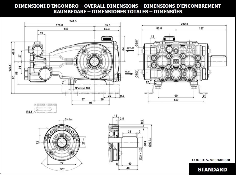 Насос Interpump Evolution E2B2014 для установки в АВД и мойки высоким давлением. Керамические поршни, латунная головка. Совместима с аппаратами Portotechniсa ML CMP DS 2860 T, ML CMP 2860 T.