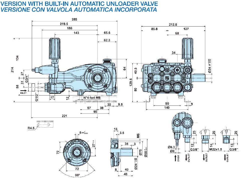 Насос Interpump Evolution E2B2014 с регулятором для установки в АВД и мойки высоким давлением. Керамические поршни, латунная головка. Совместима с аппаратами Portotechniсa ML CMP DS 2860 T, ML CMP 2860 T.
