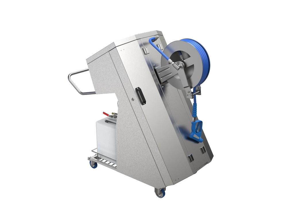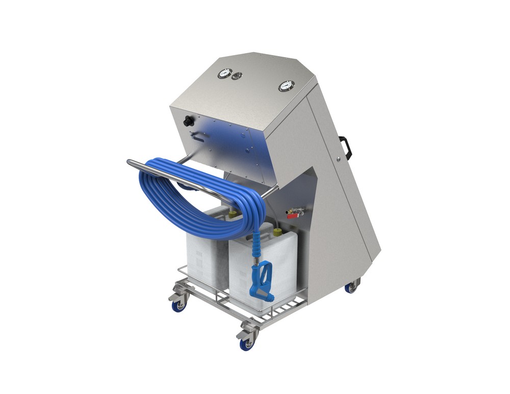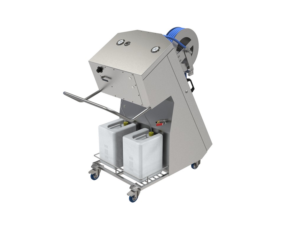 Мобильная пенная станция MPS-1-20/400 предназначена для проведения качественной пенной мойки на пищевых производствах. Встроенный вертикальный центробежный насос повышает входной поток до 20 бар, а частотный преобразователь поддерживает заданное давление. Встроенный воздушный без масляный компрессор подает сжатый воздух при работе в режиме запенивания. Имеется место для установки двух двадцатилитровых канистр.