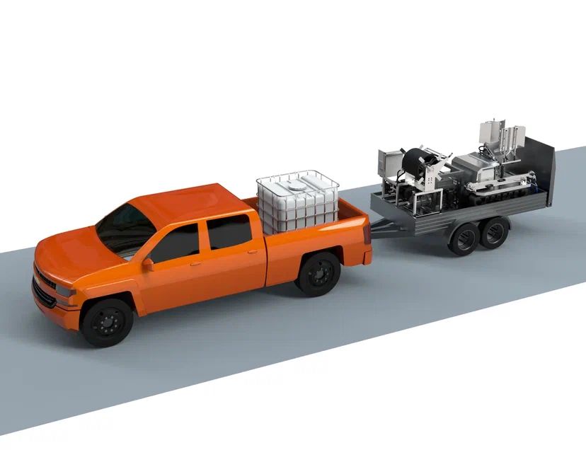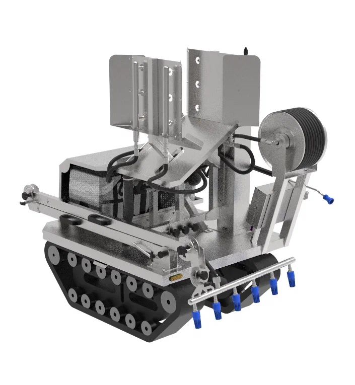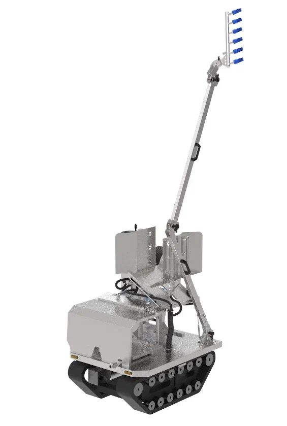Роботизированная гусеничная платформа доставляется до места проведения моечных работ, выгружается рядом со входом в птичник и соединяется с базовой станцией при помощи рукава