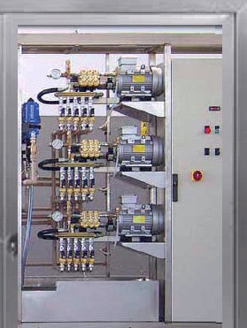 Технологический шкаф на раме 18/10 из нержавеющей стали. Блок управления на программаторе schneider electric с интерфейсом на русском языке с возможностью удаленного доступа с мобильного устройства с помощью приложения Vijeo Designe. Электромагнитные клапаны 24В, группа высокого давления (Comet) 5,5 кВт, 15л/мин, 100-150 Бар, (по запросу другие характеристики) антивибрационные блоки для поддержки двигателей и насосов. Частотный преобразователь для плавной регулировки давления на АВД. Устанавливается по одному на каждый пост. Инвертор – электронный контроль насоса высокого давления , позволяющий