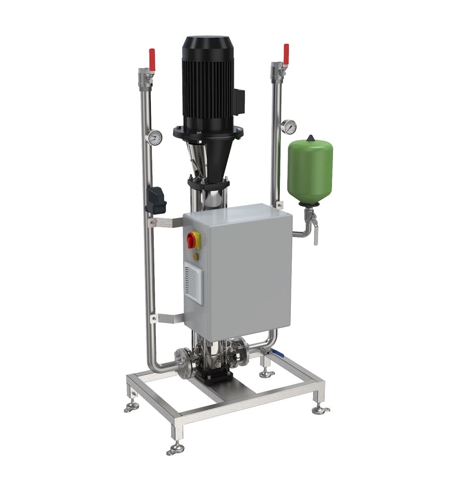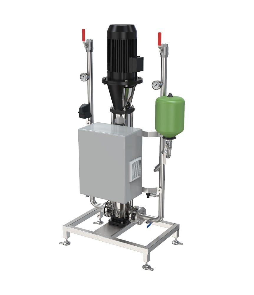 Используемый вертикальный насос повышения давления отличается коррозийной стойкостью, бесшумной работой, высокой эффективностью и компактной конструкцией. Комплект автоматики обеспечивает поддержание стабильного давления на всех потребителях – сателлитных станциях, независимо от того, какое их количество задействовано в моечно-дезинфицирующих работах в данную минуту. Датчик контроля входного потока - защита от сухого хода и Датчик контроля температуры, подадут сигнал на отключение насоса, в случае падения давления воды на входе ниже минимального и превышении максимально допустимой температуры, тем самым, они сберегут насос от серьезной поломки.