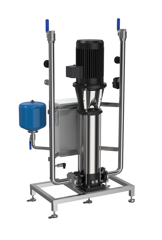 Используемый вертикальный насос повышения давления отличается коррозийной стойкостью, бесшумной работой, высокой эффективностью и компактной конструкцией. Комплект автоматики обеспечивает поддержание стабильного давления на всех потребителях – сателлитных станциях, независимо от того, какое их количество задействовано в моечно-дезинфицирующих работах в данную минуту. Датчик контроля входного потока - защита от сухого хода и Датчик контроля температуры, подадут сигнал на отключение насоса, в случае падения давления воды на входе ниже минимального и превышении максимально допустимой температуры, тем самым, они сберегут насос