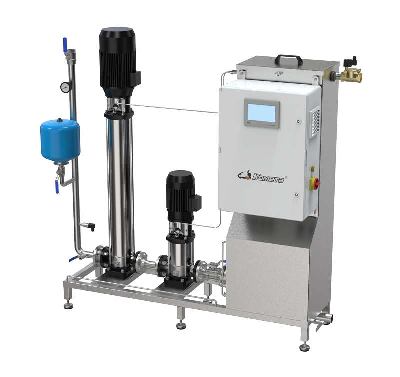 Насосная станция подключается к системе водоснабжения предприятия. Устанавливается она в отдельном сухом помещении вне цеха, где будут проводиться моечно-дезинфицирующие работы, либо в цеху, но в безопасном для станции месте, исключающем попадание брызг и прямых струй воды, способных вывести из строя автоматику.