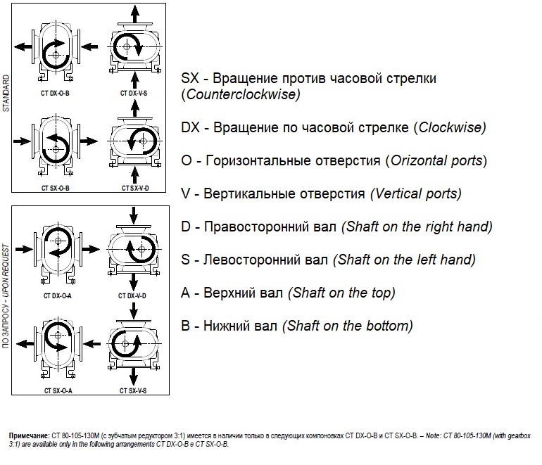 Прямой вал, вращение против часовой стрелки, порты расположены горизонтально, вал внизу