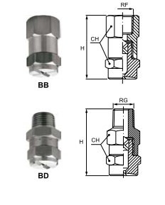 Полноконусные форсунки серии ВВ/BD состоят из трех деталей: корпус, Х-образный завихритель и крепление. Они создают полноконусную струю с квадратным сечением распыла и подходят для применения в тех сферах, где требуется строго равномерное распределение распыла. Аналогично форсункам серии ВА/ВС, имеющим круговой распыл, отличительной чертой этих изделий является наличие Х-образного завихрителя, который позволяет получить превосходную степень атомизации струи, а комплектация из трех деталей облегчает разборку и чистку этих форсунок.