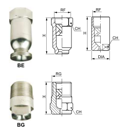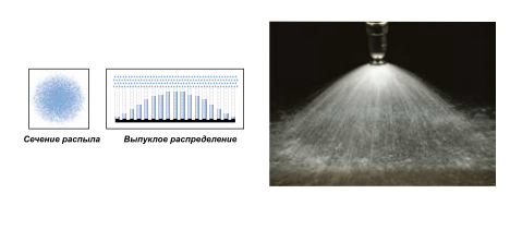 Форсунки серии BE/BG состоят из двух частей и создают конический круговой распыл под углами от 70° до 120° при значениях расхода от 4,8 до 1,040 л/мин, давление 3 бар. Х-образный завихритель обеспечивает равномерное распределение распыла.
