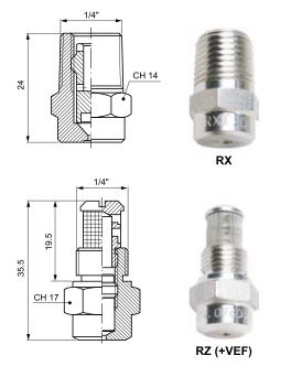 Гидравлические форсунки серии RX/RZ создают полоконусный распыл мелкодисперсной атомизации, в том числе при низком давлении. Они содержат внутренний завихритель крошечных размеров, обработанный с высочайшей степенью точности, который можно легко вынуть для очистки в случае засорения. Засорения можно избежать, если поставить мелкосетчатый фильтр на питающем трубопроводе или с помощью индивидуальных фильтрующих картриджей.