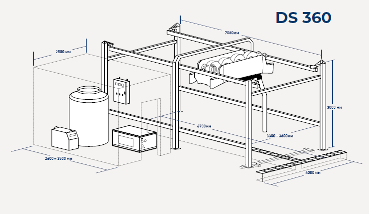 днаи колёс, системананесения эмульсии, система дозирования химии, мойка высоким давлением, монтажная рама, система сушки)