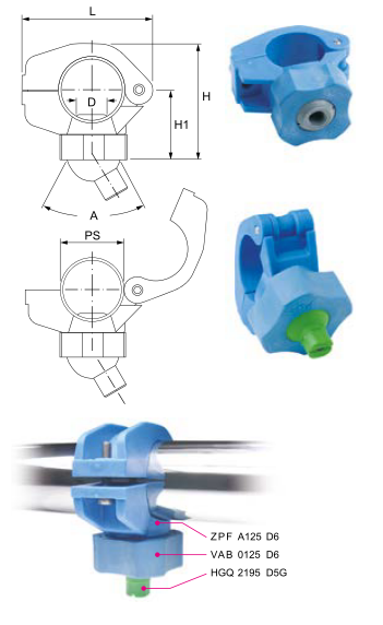 Поворотные шарнирные хомуты ZPF специально разработаны для форсунок серий HGQ, RGN и ZBA. Для установки на трубу достаточно лишь просверлить отверстие, вставить в него хомут и зафиксировать его с помощью отвертки. Корпус хомута выполнен из полипропилена, армированного стекловолокном, а штифт и болты — из нержавеющей стали AISI 316. Эти хомуты прочны, легко устанавливаются, регулируются, снимаются и проверяются. Их дизайн произвел революцию в современном оборудовании для пред покрасочной обработки. Хомуты имеют прекрасные рабочие показатели при высоких температурах, а направление струи с таким хомутом можно легко и точно регулировать. Типичные области применения: оборудование для туннельной мойки при предварительной подготовке поверхностей