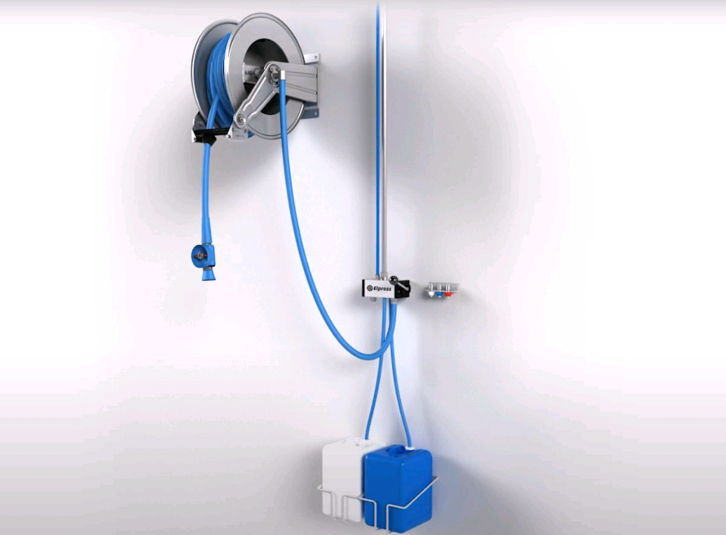 В данную комплектацию входит: пенная станция среднего давления (15-40 бар) на два средства, автоматический барабан из нержавеющей стали с поворотным кронштейном для шланга 20 метров, комплект опресованного пятислойного шланга для пищевой промышленности: диаметром 1/2, с хар-ками 50 бар и 70 градусов, кран для пены с комплектом быстросьемных соединений из нержавеющей стали, а также комплект насадок с форсунками для нанесения пены, дезинфекции и смыва также из нержавеющей стали. Для канистр с химией предусмотрен канистродержатель.