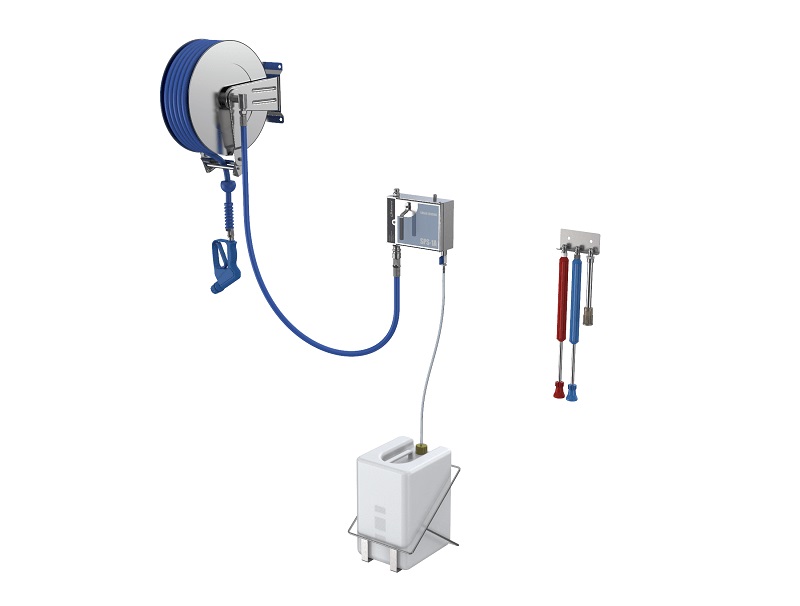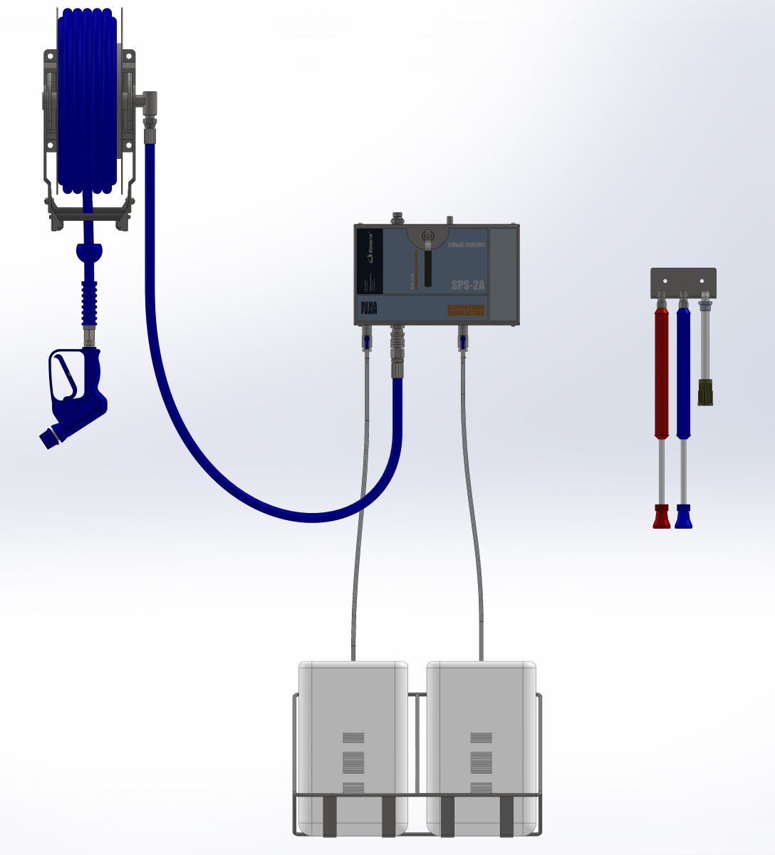 Основой моющего поста является сателлитная станция SPS-1A, где происходит смешивание воды и концентрата моющего пенного или дезинфицирующего средства. Пенной станции потребуется подключение к воздушной магистрали, если необходимо пенообразование. SPS-1A монтируется на стену, при помощи комплекта винтов.