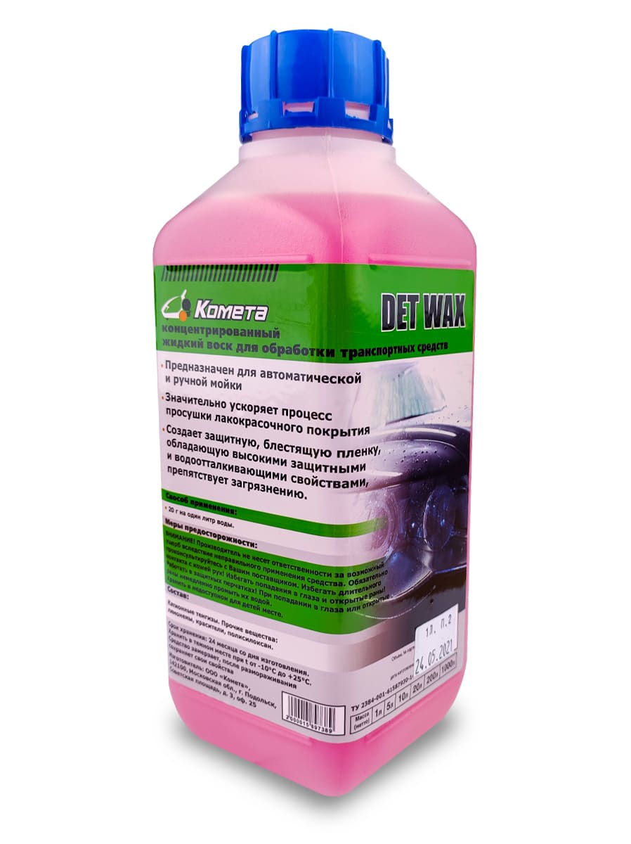 Средство DET WAX представляет собой окрашенную жидкость, смешивающуюся с водой в любых соотношениях. Оставляет после себя блестящую поверхность без подтеков. Обеспечивает эффективную защиту от грязи, пыли и влаги, а также ультрафиолетовых лучей, которые негативным образом влияют на состояние автомобиля. Создает защитную пленку, препятствуя дальнейшему загрязнению. Предохраняет лакокрасочное покрытие от окисления и препятствует глубокому проникновению дорожной пыли и грязи в глубину покрытия. Продлевает срок службы лакокрасочного покрытия. Эффективен при использовании в жесткой воде и при низкой температуре.