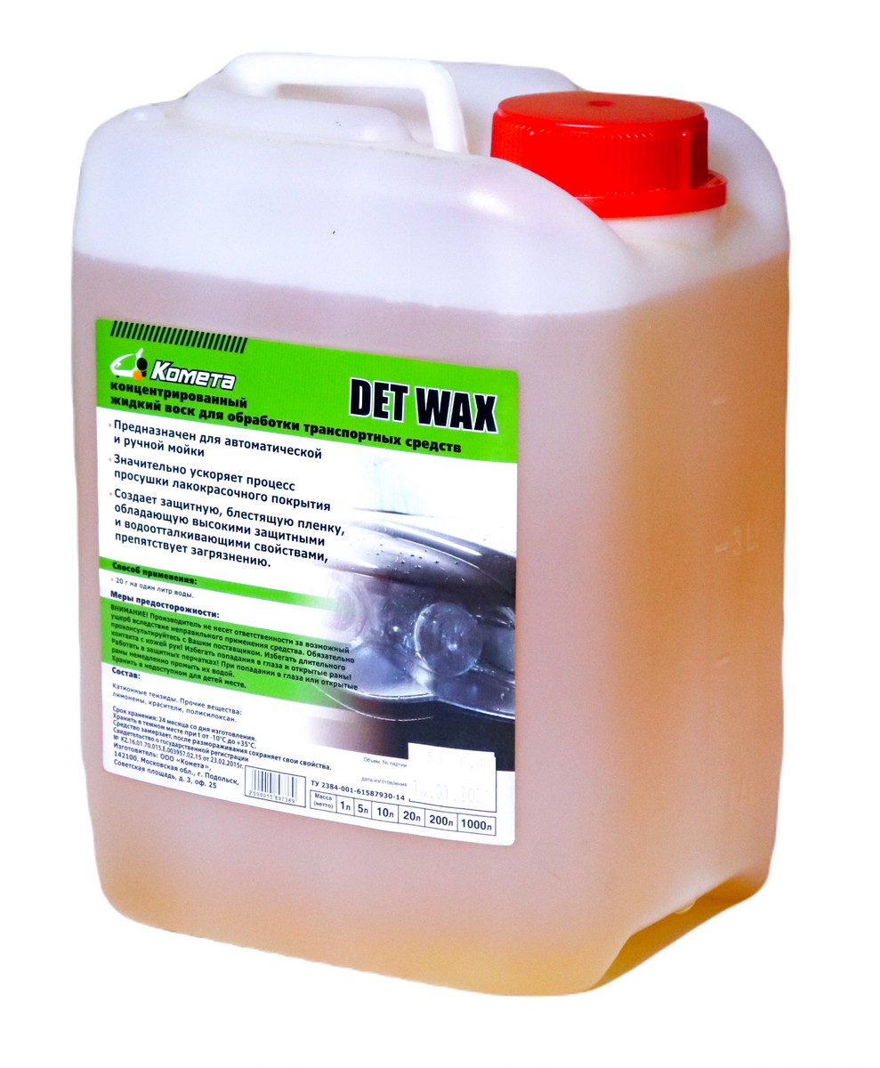 Средство DET WAX представляет собой окрашенную жидкость, смешивающуюся с водой в любых соотношениях. Оставляет после себя блестящую поверхность без подтеков. Обеспечивает эффективную защиту от грязи, пыли и влаги, а также ультрафиолетовых лучей, которые негативным образом влияют на состояние автомобиля. Создает защитную пленку, препятствуя дальнейшему загрязнению. Предохраняет лакокрасочное покрытие от окисления и препятствует глубокому проникновению дорожной пыли и грязи в глубину покрытия. Продлевает срок службы лакокрасочного покрытия. Эффективен при использовании в жесткой воде и при низкой температуре.